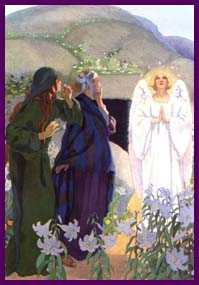Just before Jesus was crucified, He spent some time in a lovely garden called the Garden of Gethsemane. Jesus was talking to His Father in heaven. They were discussing the plan. Jesus was full of sorrow, knowing what was going to happen to Him, but He said to the Father, "Thy will be done." After He was done praying, a mob of people came to get Him. The mob was led by Judas! Judas was one of Jesus' twelve disciples, but Judas became a traitor. He identified Jesus for the mob. The crowd carried Jesus off to the house of the high priest, where He was blindfolded, beaten up, and made fun of. They pushed sharp thorns into His head. Jesus meekly put up with all this, because He knew it was going to help you and me in the long run. He endured this for us! The priests decided that Jesus should be put to death, even though they didn't have any evidence. They sent Him to Pilate, the Roman leader. They told Pilate lies about Jesus. Pilate didn't really believe the lies, but he ordered Jesus to be put to death anyway, on a cross. So Jesus was nailed to the cross, and He died. But that's not the end of the story! His body was placed in a tomb, but three days later, three ladies went to visit the tomb. They wondered how they were going to move the boulder that sealed the tomb. To their amazement, when they arrived, the boulder had been moved aside! And even more amazing, when they entered the tomb, they found a young man in a white robe sitting where they expected to find Jesus' body. But this young man wasn't Jesus! It was an angel! The angel said, "Don't be afraid!" [This is what angels always say!] "You're looking for Jesus, who was crucified. He is risen! He's not here! See the place where His body was laid? Go tell the disciples (and Peter!). He's going to Galilee; you'll see Him there!" Jesus arose from the dead! He is alive!